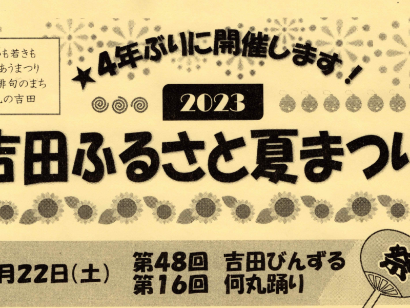 今年は、4年ぶりに「吉田ふるさと夏祭り」を開催いたします。 7月22日(土)は、「第48回 吉田びんずる」「第16回 何丸踊り」を行い 7月23日(日)は、「わいわいドームまつり こども広場」を、なが …